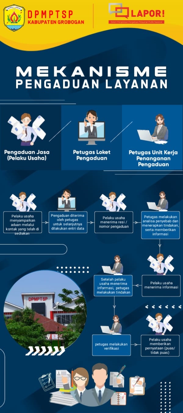 - Menyampaikan aduan dengan formulir (terlampir) yang ditujukan kepada Kepala DPMPTSP Kabupaten Grobogan dengan cara diantar atau kirim melalui jasa pengiriman pos.