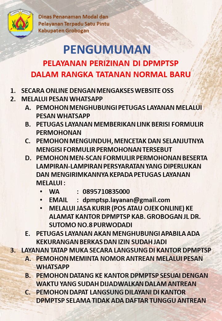 Jalan Paramedis Kompleks Simpang Lima Purwodadi Grobogan (0292) 421193 dpmptsp@grobogan.go.id
